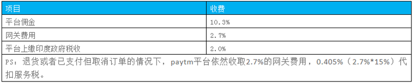Paytm平臺不分品類收取統(tǒng)一15%的費用,包括平臺傭金、網(wǎng)關(guān)費用及印度稅收三個方面,具體如下: