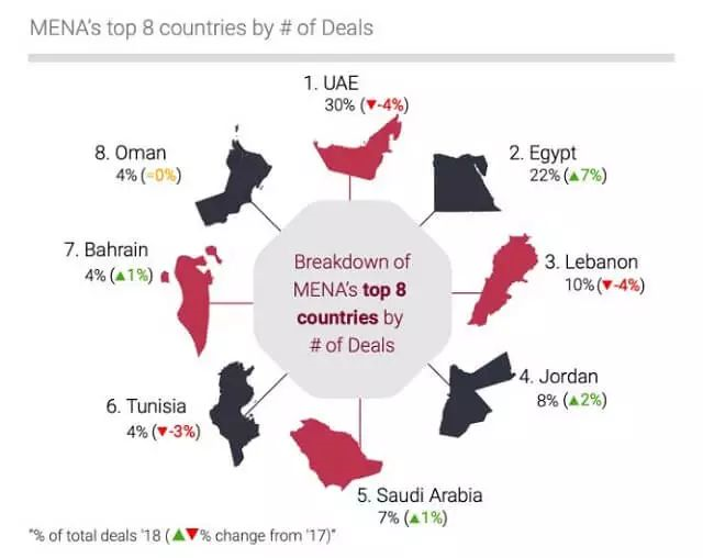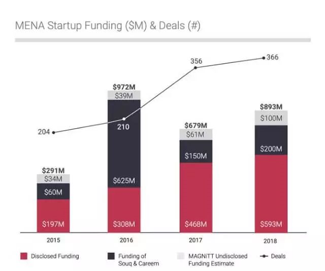 總部位于迪拜的Startup數據公司Magnitt最近發布了中東北非地區2018年的投融資數據:全年總共發生了366起投融資事件,總融資額8.93億美金,比2017年增長了31%。